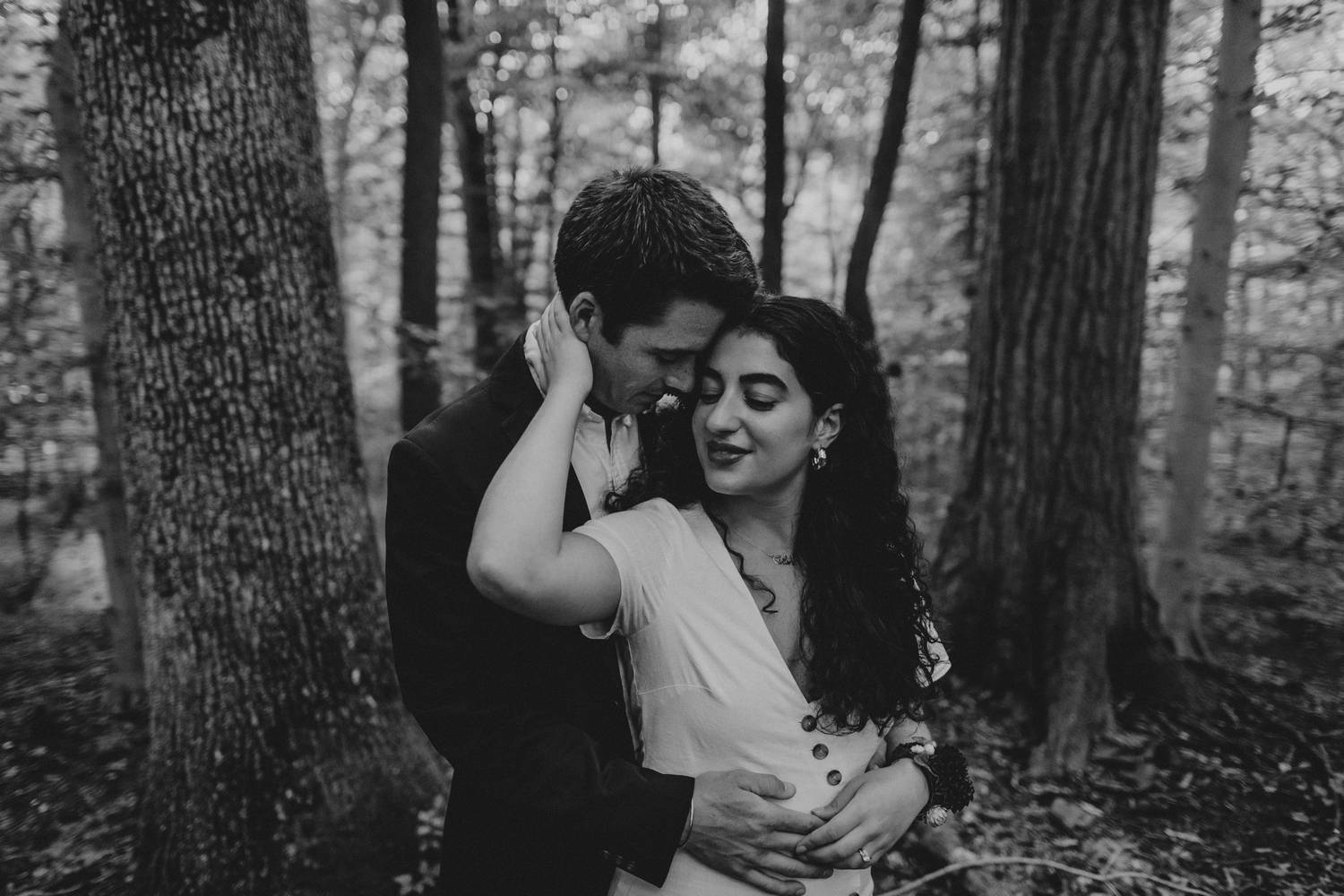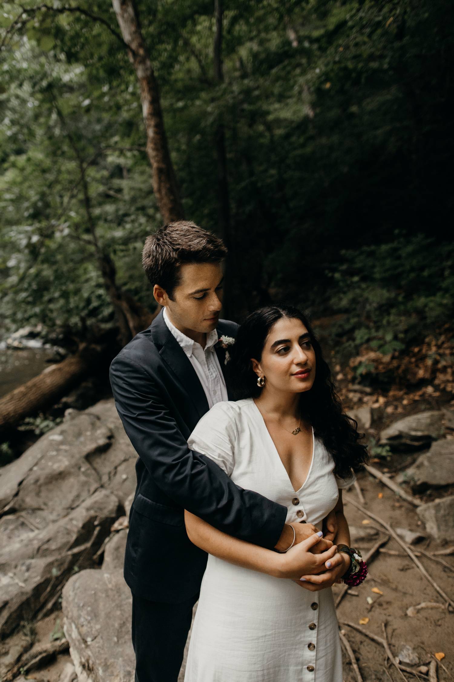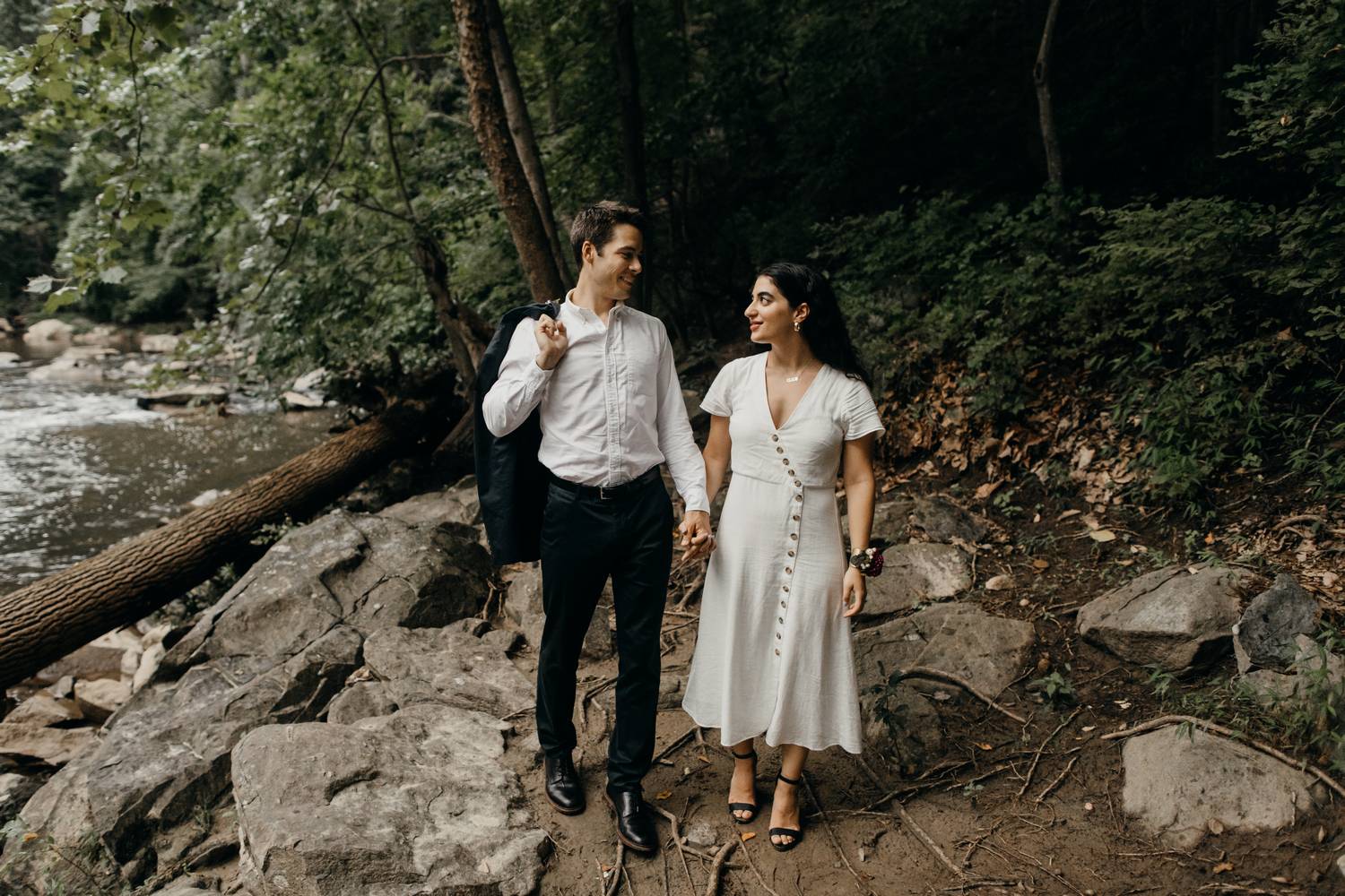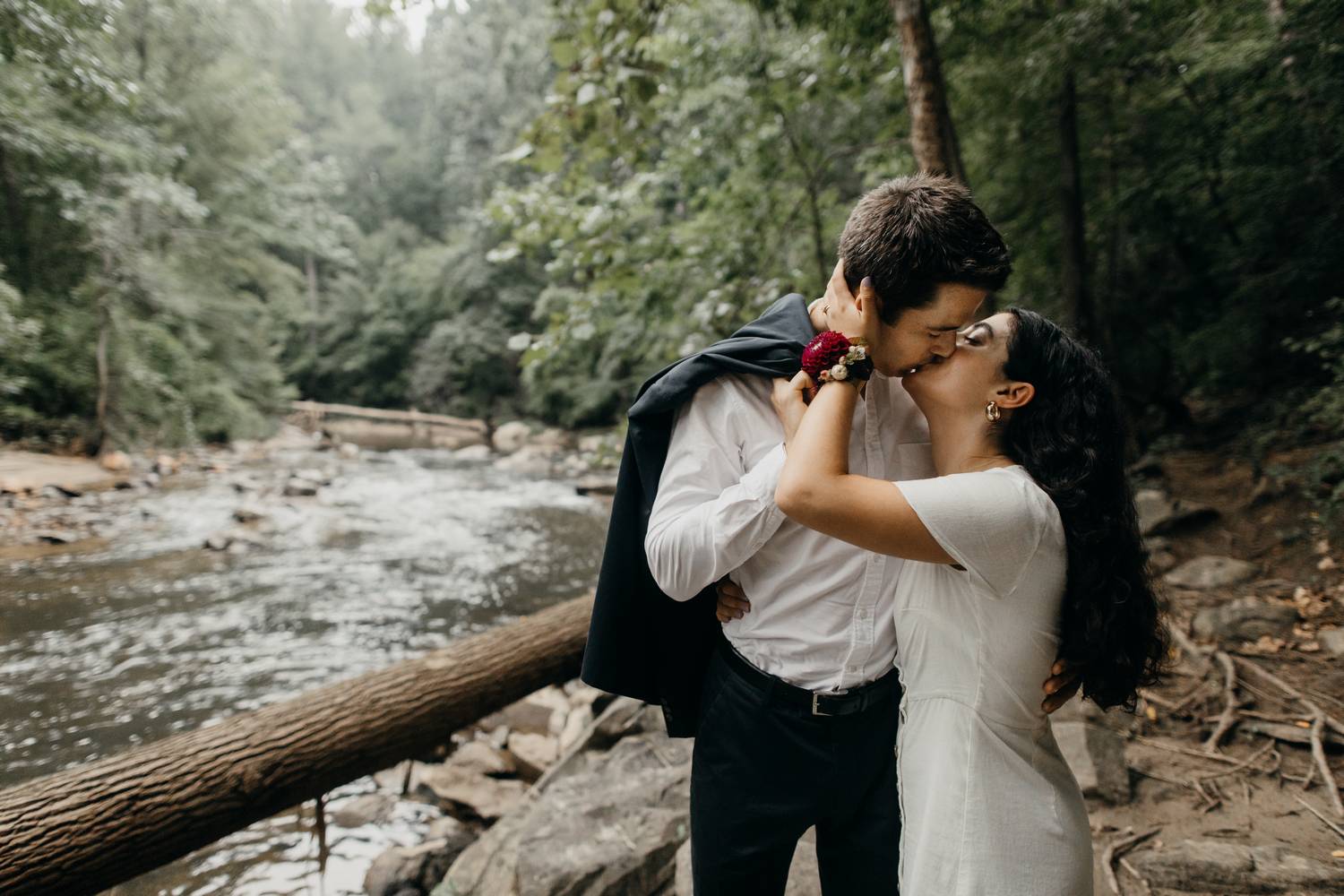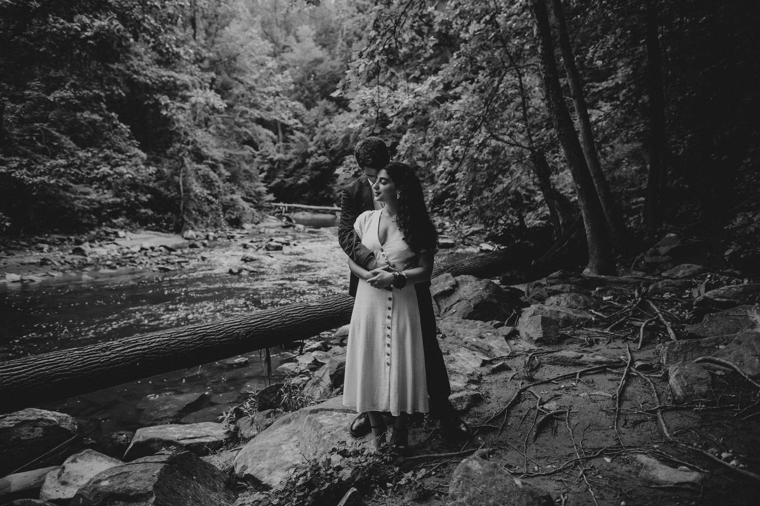 A wooded scene is one of my favorite kinds of areas to photograph. It makes such a peaceful and serene backdrop for capturing the love between two people. Nadine and Nic put up with a little hike to get to this river trail in DC, but the results were worth it! Just as we were finishing up it started to rain.